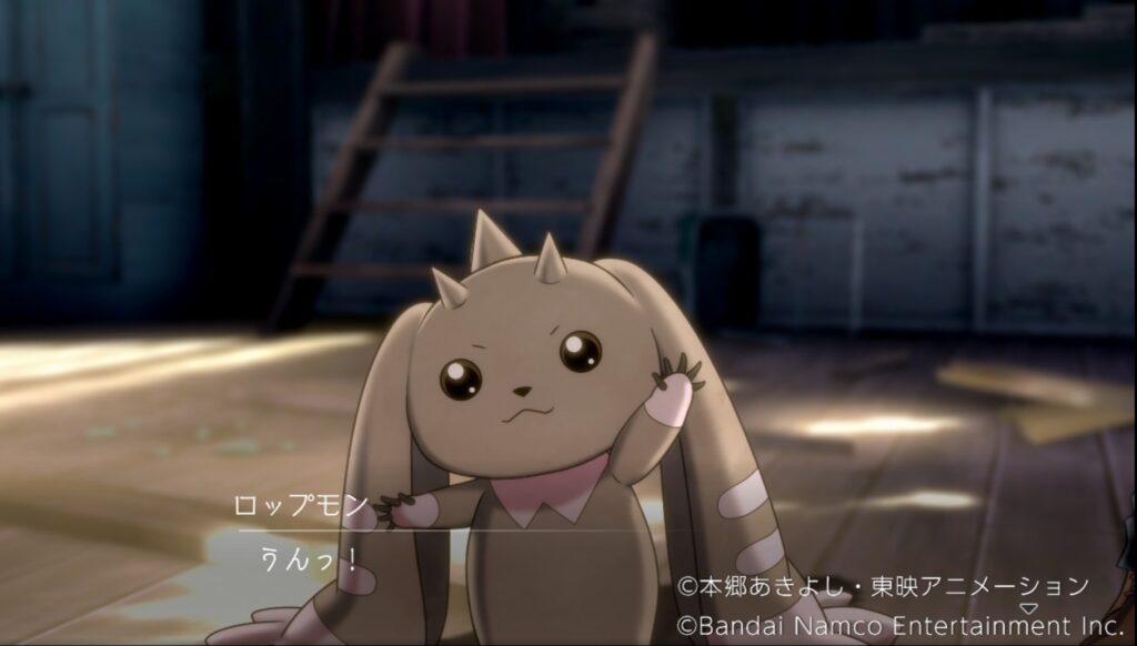 ロップモンがなにか励ましの言葉言ったあと…エイエイオー仕草のあと、「お前には聞いてない!」とほぼ必ず罵倒されるの、かわいそう…。(画像は真実ルートの和解後なので、平和な会話です。)