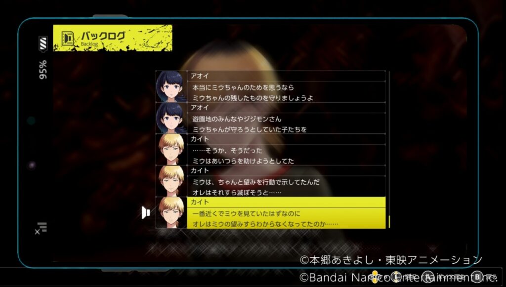 傷心の中で、ミウが守った遊園地のベビィデジモンの世話をする展開は見てみたかった気もしますが…。(道義ルートでは存在します。)